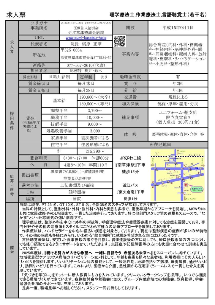 (求人)近江草津徳洲会病院 2025年10月15日 最終更新日時 : 2025年10月15日 運営 各位平素より県士会活動にご協力頂き、ありがとうございます。求人情報が届いております。ご興味のある先生は、下記をご確認下さい。広報部 2025年近江草津徳洲会病院リハ科求人票ダウンロード FacebookXBlueskyHatenaCopy